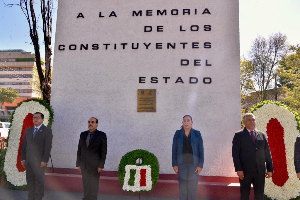 Reafirmando el compromiso institucional con los principios históricos que han dado forma a la vida pública y democrática del Estado de México, la diputada Martha Azucena Camacho Reynoso (morena), presidenta de la Directiva de la LXII Legislatura, y el diputado Gerardo Pliego Santana (morena) participaron en la ceremonia y guardia solemne de honor con motivo del 108 aniversario de la Constitución Política del Estado Libre y Soberano de México, realizada en el monumento en Memoria de los Constituyentes, en Toluca.