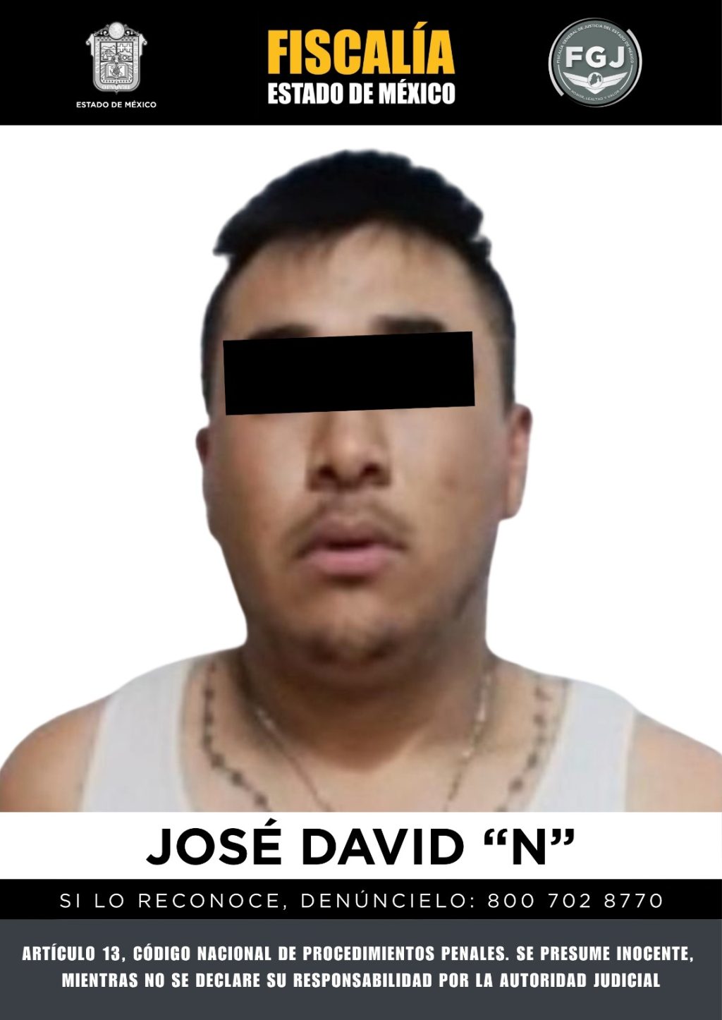 Una vez que la Fiscalía mexiquense tuvo conocimiento de este hecho, inició la investigación que permitió identificar a José David “N” como uno de los posibles partícipes por lo que solicitó la orden de aprehensión en su contra. Una vez detenido fue ingresado en el Centro Penitenciario y de Reinserción Social de la zona a disposición de la Autoridad Judicial.